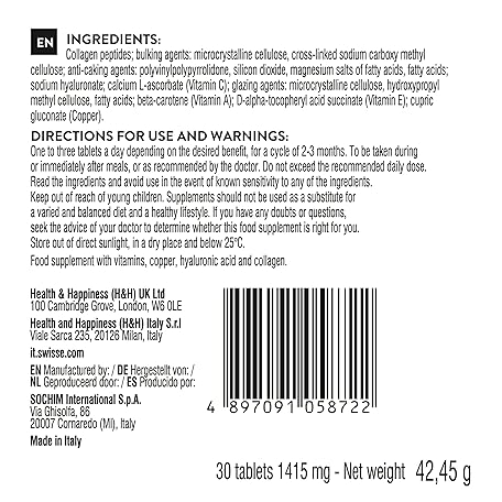 Thông tin sản phẩm SWISSE Hyaluronic Acid and Collagen - Collagen Supplements for Women & Men with Vitamin C & E, Copper, 30 Tablets - Protection from Oxidative Stress & Wrinkle Reducing Supplement - Made in Italy