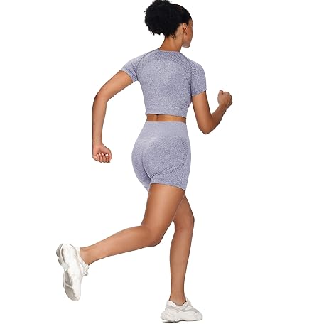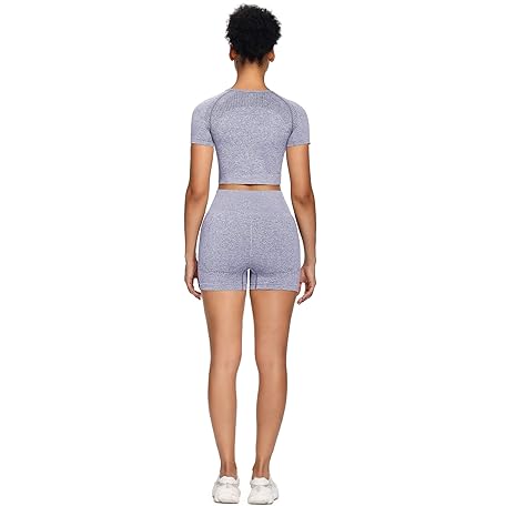 • Sytiz Women Seamless Yoga Outfits 2 Piece Set Workout Gym Shorts + Short Sleeve Crop Top