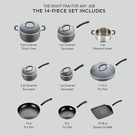 Thông tin sản phẩm T-fal E765SEFA Hard Anodized Cookware Set, Nonstick Pots and Pans Set, 14 Piece, Thermo-Spot Heat Indicator, Gray