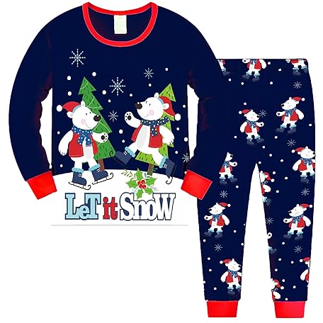 TCWWBB Boys Girls Christmas Pyjamas for 9-10 Years Old Kids Unisex Xmas Pjs Set Let it Snow Bear Print Navy Blue Nightwear Children Crewneck Cotton Long Sleeve 2Pcs Sleepwear