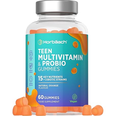 Teen Multivitamin Gummies with Probio | 60 Count | 15 Key Nutrients with Vitamin C, Biotin and Zinc | + 3 Biotic Strains | Natural Orange Flavour | Vegan | by Horbaach