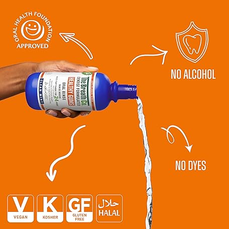 Thông tin sản phẩm The Breath Co. Healthy Gums Mouthwash, Dentist Formulated Oral Rinse for 24 Hours of Plaque Control with Anti-Microbial Ingredient, Alcohol Free, Non-Burning, 500ml