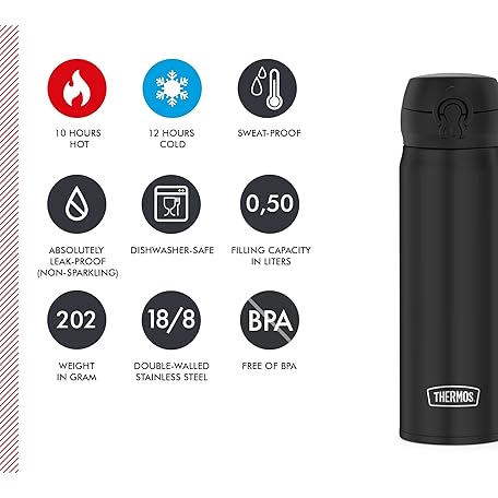 Thông tin sản phẩm THERMOS 4035.232.050 Ultralight Thermos Flask, Black, 500 ml, Extremely Lightweight, 210 g, Drinking Bottle, Dishwasher Safe, Thermos Flask Keeps Hot for 10 Hours, Cold for 20 Hours, BPA-Free