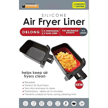 Toastabags Silicone Air Fryer Liner Set, Rectangle Oblong Shape, 4 Pack with 2 Perforated and 2 Base Liners, Non-Stick, Dishwasher Safe, for Dual Drawer Fryers
