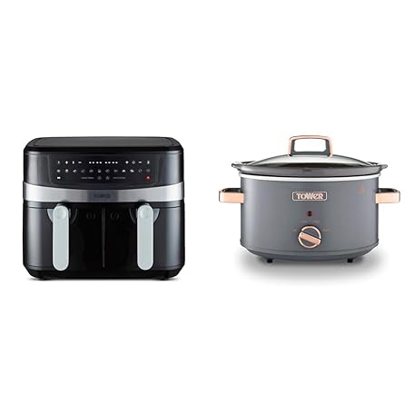 Tower T17088 Vortx 9L Dual Basket Air Fryer with Smart Finish, 2600W, Black & T16042GRY Cavaletto 3,5 Litre Slow Cooker with 3 Heat Settings, Cool Touch Handles, 210W, Grey and Rose Gold