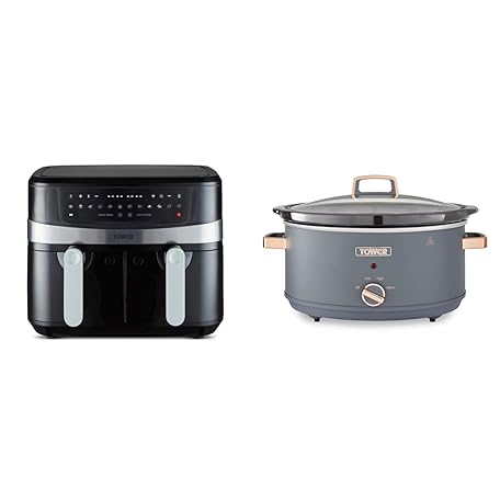 Sản phẩm Tower T17088 Vortx 9L Dual Basket Air Fryer with Smart Finish, 2600W, Black & T16043GRY Cavaletto 6.5 Litre Slow Cooker with 3 Heat Settings, Cool Touch Handles, Grey and Rose Gold đang được bán với giá ưu đãi là 0 tại nước Anh.