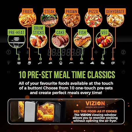 Thông tin sản phẩm Tower, T17100, Vortx Vizion 9L Dual Basket Air Fryer with Digital control panel & 10 One-touch Pre-sets, Black