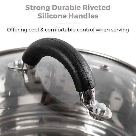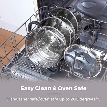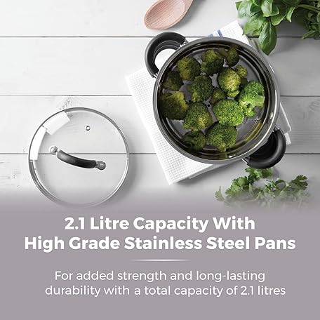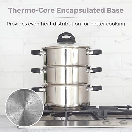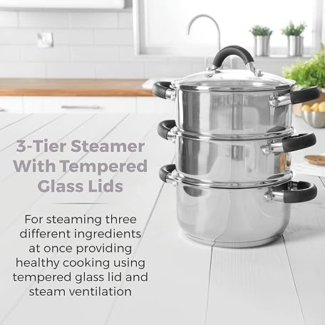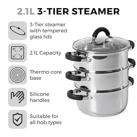 Thông tin sản phẩm Tower T80836 3-Tier Steamer with Encapsulated Base and Tempered Glass Lid with Steam Release Vent, Induction Compatible, Stainless Steel, Silver