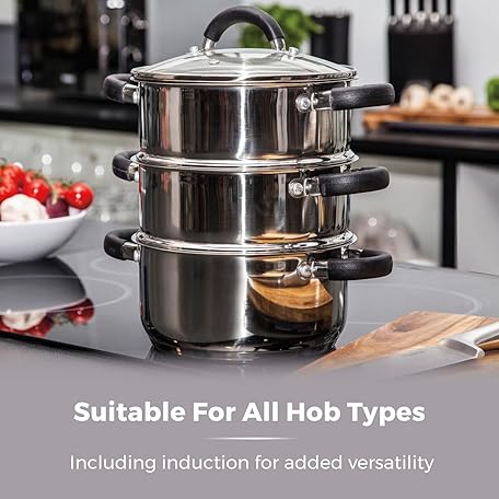 Sản phẩm Tower T80836 3-Tier Steamer with Encapsulated Base and Tempered Glass Lid with Steam Release Vent, Induction Compatible, Stainless Steel, Silver đang được bán với giá ưu đãi là $43.3275 tại nước Anh.