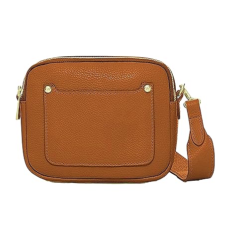 Trendy Italian Leather Camera Style Crossbody Shoulder Bag With Double Zip & Wide Strap (Tan)
