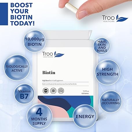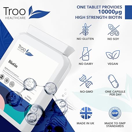 Sản phẩm Troo Health Care Biotin 10000µg Supplement - 120 High Strength 10000 mcg Vitamin B7 Tablets for Hair Skin and Nail Support - UK Manufactured to GMP Standards - 4 Month Supply đang được bán với giá ưu đãi là $11.8592 tại nước Anh.