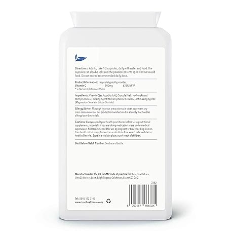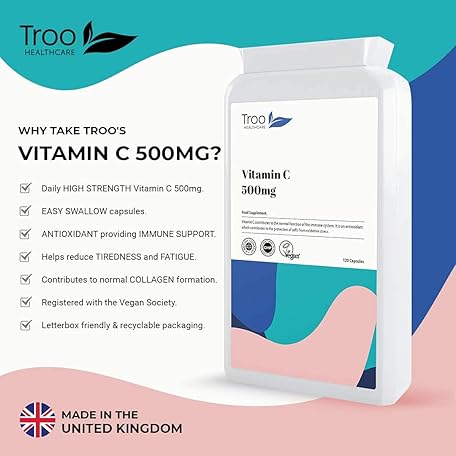 Sản phẩm Troo Health Care Vitamin C 500mg Supplement 120 Capsules - High Strength - Easy Swallow - Immune Support Reduces Fatigue đang được bán với giá ưu đãi là $11.7066 tại nước Anh.