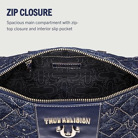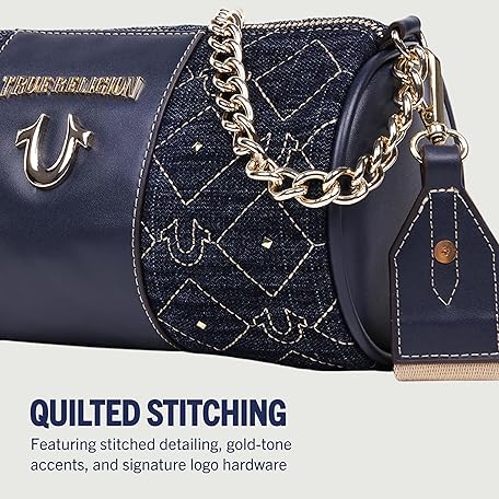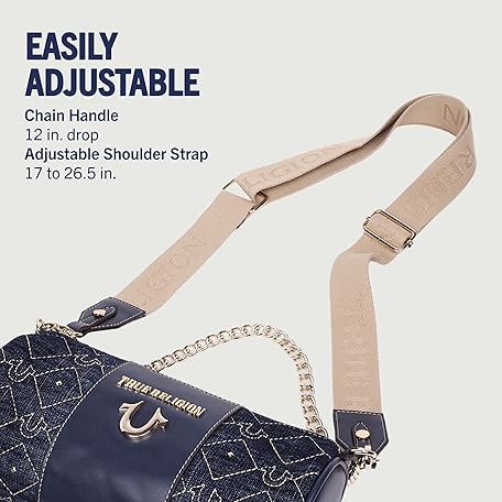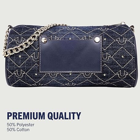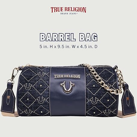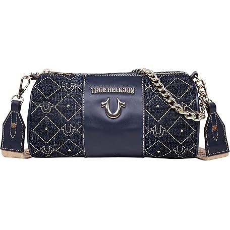 Thông tin sản phẩm True Religion Unisex's Barrel Bag, Studded Zip Top Purse with Chain Handle, Adjustable Crossbody Strap and Gold Hardware, Dark Denim