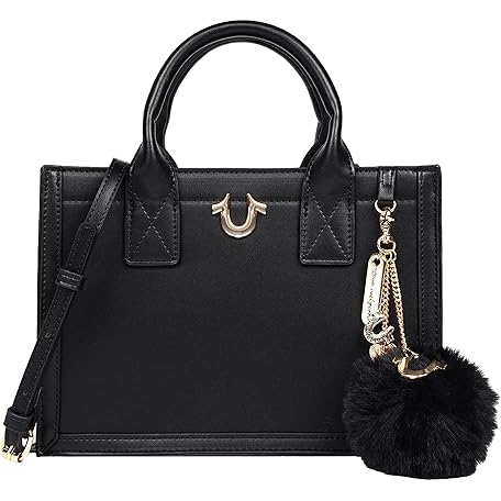 True Religion Unisex's Dangle Modern Tote, Structured Shoulder Bag with Removable Pom Charm, Spacious Interior, Black