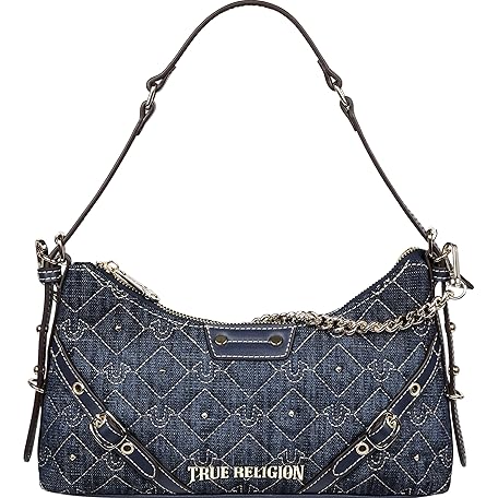 True Religion Unisex's Shoulder Bag, Studded Chain Purse with Quilted Horseshoe Stitching, Detachable Handle and Gold Hardware, Dark Denim