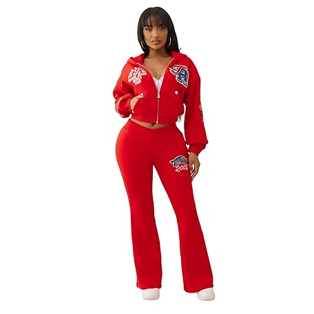 True Religion Women's Crystal Patched Zip Hoodie Hooded Sweatshirt, Flame Scarlet, Large