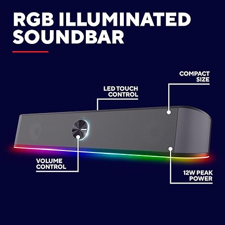 Thông tin sản phẩm Trust Gaming GXT 1619 Rhox RGB Illuminated Soundbar, PC Speakers, 12W Peak Power, USB Powered Sound Bar, 3.5mm Jack, Plug and Play, Stereo PC Soundbar for Desktop, Laptop, Computer – Black/Grey