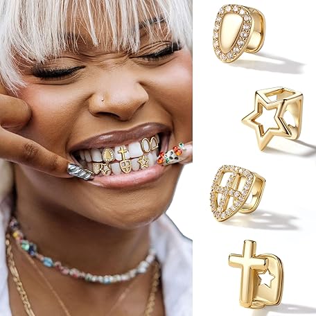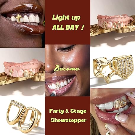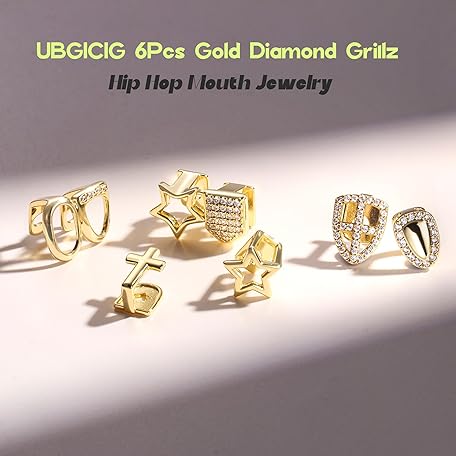 UBGICIG 6Pcs Dental Grillz, Single Grills for Your Teeth, Gold Plated Tooth Cap Fake Grill, Diamond Grillz Teeth for Men Women, Vampire Faux Halloween Top Teeth Kit, Hip Hop Jewelry with Molding Bars