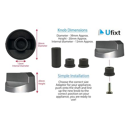 Thông tin sản phẩm Ufixt 6 x Fits Panasonic, Rosieres, Scholtes, Servis, Stoves, Thorn, Tricity and Tricity Bendix Universal Cooker/Oven/Grill Control Knob And Adaptors Silver