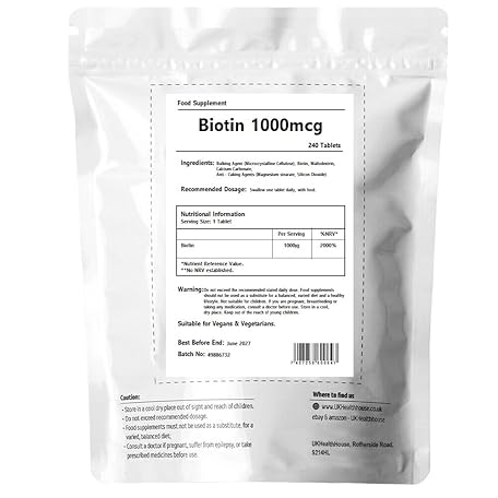 Sản phẩm UKHealthHouse High Strength Biotin 1000mcg - 240 Tablets, Hair Growth Supplement, Support Normal Nails and Skin, Gluten Free & Vegan đang được bán với giá ưu đãi là $9.4612 tại nước Anh.