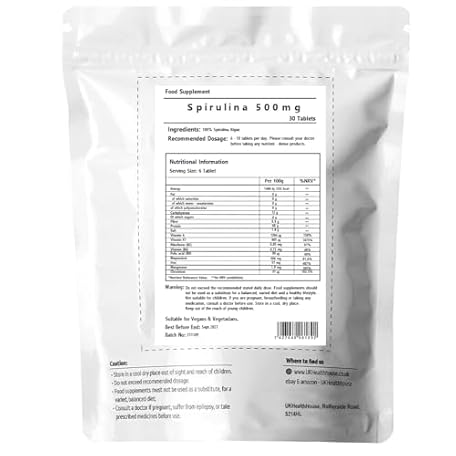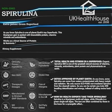 Thông tin sản phẩm UKHealthHouse Premium Spirulina 500mg x 30 Tablets - High Strength Pure Green Detox Cleanse Natural Superfood, Vegan, Protein Iron Vitamins Nutrition