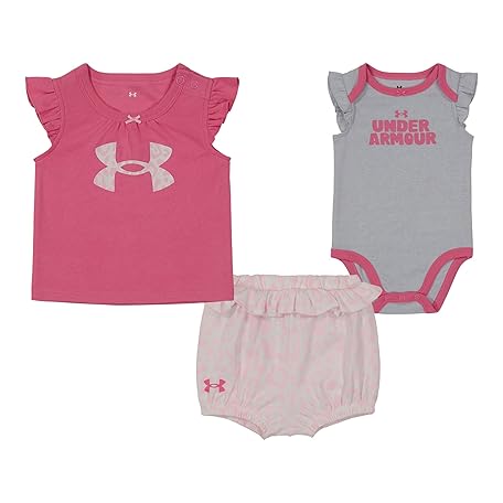Under Armour Baby Girls 3 Piece Set Bodysuit with Matching Top and Bottom Lightweight Relaxed Fit, Pink trim, 24 Months