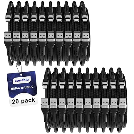 USB A to USB C Cable (1 FT, 20-Pack), Multi Pack Bulk Nylon USB A to C Charger Cable, 3A Fast Charging for iPhone 15/15 Plus /15 Pro Max, iPad Mini/Air/Pro, Galaxy S23, LG