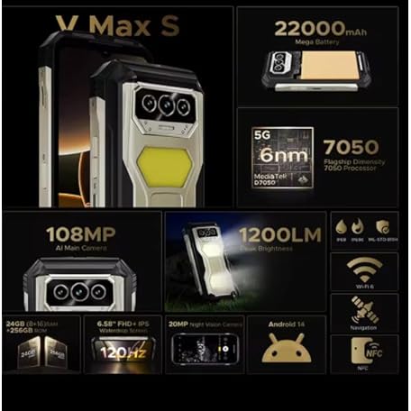 Sản phẩm V Max S 5G Rugged Phone Dual Camping Lights 22000mAh Battery Android 15 24GB (8+16) 256GB 108MP AI Camera Smartphone đang được bán với giá ưu đãi là $484.7121 tại nước Anh.