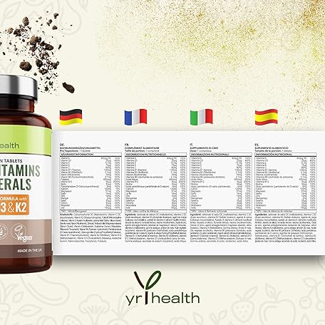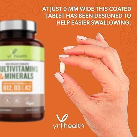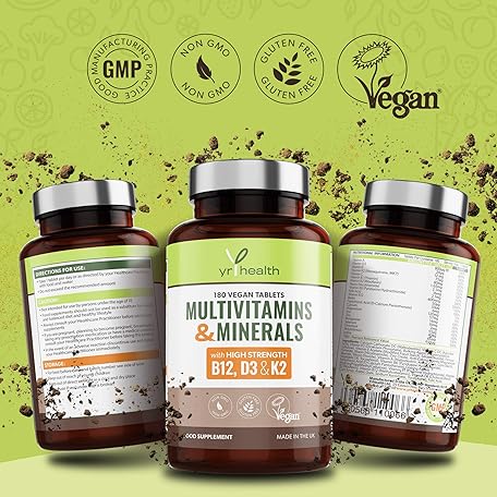 Thông tin sản phẩm Vegan Multivitamins & Minerals with Vitamin B12, D3 & K2, Zinc and Iron, 180 Vegan Society Registered Tablets for Men and Woman, 6 Month Supply - Made in The UK by YrHealth