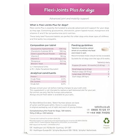 Sản phẩm VetVits Flexi-Joints Plus For Dogs (120 Tablets) | 500mg Pure Glucosamine HCI Providing 40% More Glucosamine Than The Standard 2KCI Form | With Chondroitin | Beef Flavour đang được bán với giá ưu đãi là $35.1743 tại nước Anh.