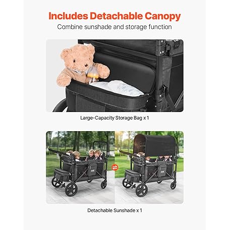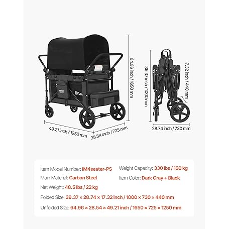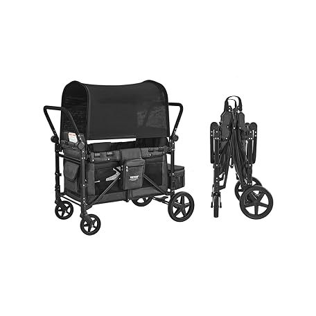 Thông tin sản phẩm VEVOR Wagon Stroller for 4 Kids, Push Pull Quad Collapsible Stroller with Adjustable Handle, Safety Harness & Removable Canopy, 4-Seater Stroller Wagon for Camping, Dark Gray & Black (330LBS Loading)