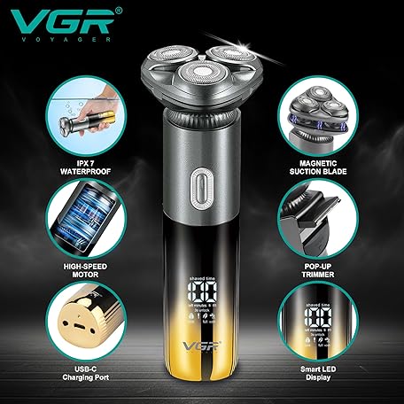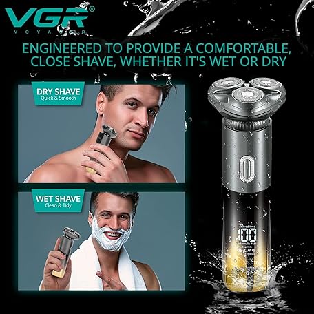 VGR Electric Rotary Shaver for Men - Face Beard Hair Razor - Cordless Rechargeable via USB-C - 200 Minutes Battery - Waterproof Shaving Machine - Wet or Dry Close Shave for Adults, Gents, Teenage Boy