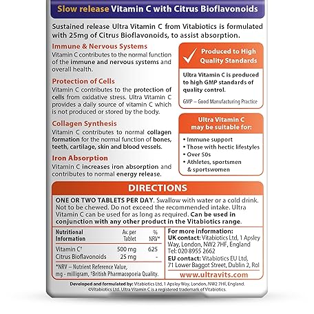 Thương hiệu Vitabiotics Ultra là cái tên nổi tiếng được rất nhiều khách hàng trên thế giới chọn lựa. Với kiểu dáng đẹp mắt, sang trọng, sản phẩm Vitamin C Tablets Sustained Release with Bioflavonoids - 60 Tablets là sự lựa chọn hoàn hảo nếu bạn đang tìm mua một món cho riêng mình.