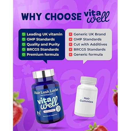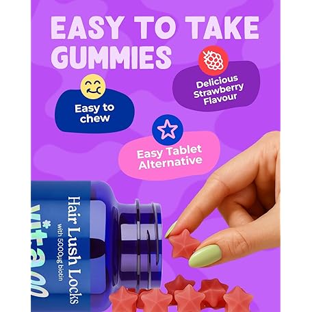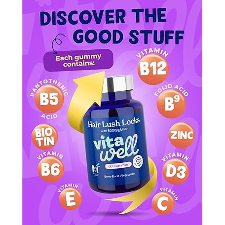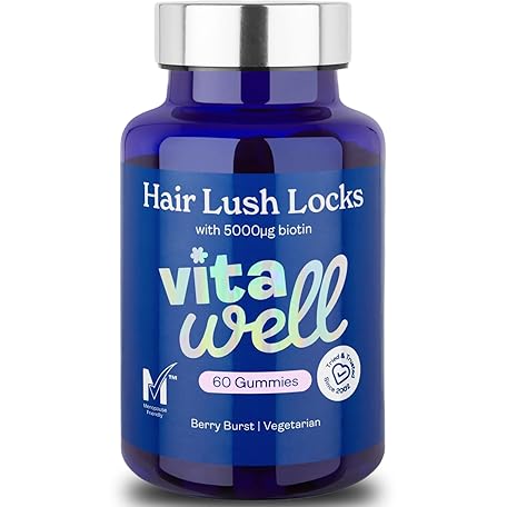 Sản phẩm Vitawell Hair Lush Locks Gummies - Hair Growth + Skin + Nails Vitamins Chews | Complex Formula 5000µg Biotin + Zinc + Vitamin A, D3, C, B12 | 60 Berry Burst Flavour | Supplement for Men & Women đang được bán với giá ưu đãi là $10.6602 tại nước Anh.