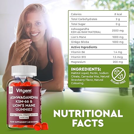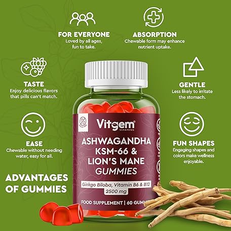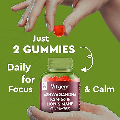 Thông tin sản phẩm Vitgem 60 Chews KSM-66 Ashwagandha and Lions Mane Gummies for Adults – Sugar-Free Natural Nootropic for Focus, Memory & Stress Relief – Vegan Berry Flavor – Cognitive & Cortisol Balance Supplement