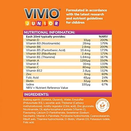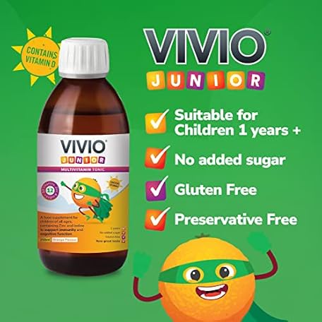 Sản phẩm VIVIO Junior Multivitamin Tonic for Kids – 12 Added Vitamins Plus Zinc & Iodine to Support Your Child’s Immunity & Cognitive Function - Orange - 250ml đang được bán với giá ưu đãi là $16.1429 tại nước Anh.