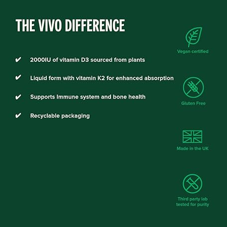 Sản phẩm Vivo life Vitamin D3 K2, 50ml Liquid Complex Drops, 2000iu of D3, Vegan Health Supplement for Men and Women, 100 Servings đang được bán với giá ưu đãi là $21.3313 tại nước Anh.