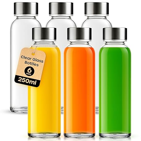 volila Glass Bottles with Lids - 6 Pack 250ml Leakproof, Reusable Glass Drinking Bottle for Water, Juice, Milk and Smoothie - with Airtight Metal Lids, Cleaning Brush and White Labels