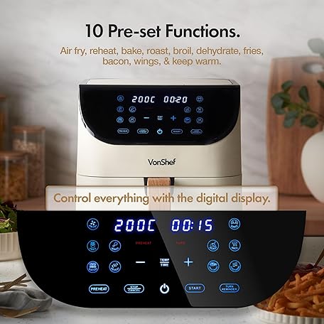 Thương hiệu VonShef là cái tên nổi tiếng được rất nhiều khách hàng trên thế giới chọn lựa. Với kiểu dáng đẹp mắt, sang trọng, sản phẩm VonShef Air Fryer 6L - 1500W Compact 10-In-1 Airfryer, Rapid Air Technology, Digital LED Display, Nordic Design, 60 Min Timer, Non-Stick & Dishwasher-Safe, Healthy Oil-Free Cooking - Fika Range, Cream là sự lựa chọn hoàn hảo nếu bạn đang tìm mua một món cho riêng mình.