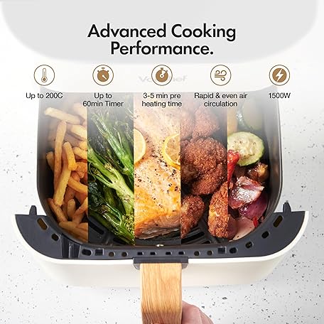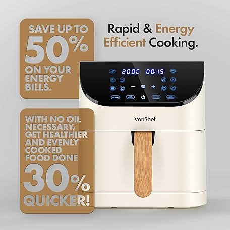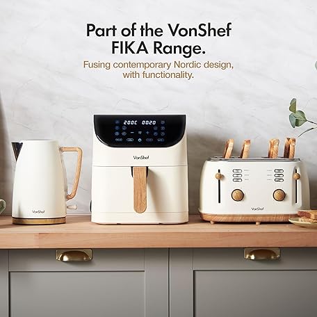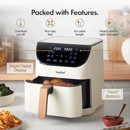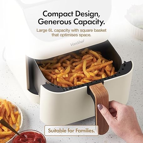 Thông tin sản phẩm VonShef Air Fryer 6L - 1500W Compact 10-In-1 Airfryer, Rapid Air Technology, Digital LED Display, Nordic Design, 60 Min Timer, Non-Stick & Dishwasher-Safe, Healthy Oil-Free Cooking - Fika Range, Cream