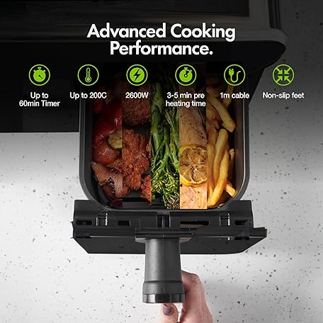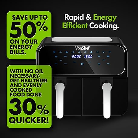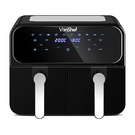 Thông tin sản phẩm VonShef Dual Air Fryer 9L - Family Size Double Airfryer, XL Capacity, 10-in-1, 2 Drawers & Silicone Liners, LED Display, Sync Cook & Smart Finish, 60-Min Timer, Dishwasher-Safe, Healthy Cooking, 2600W