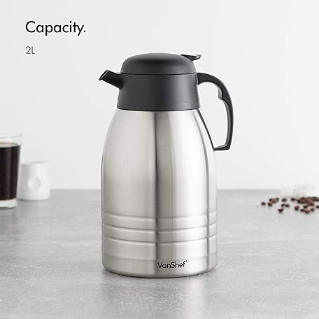 Thông tin sản phẩm VonShef Thermal Hot Drinks Flask Jug, 2L Tea & Coffee Dispenser, Vacuum Insulated Double Walled Stainless Steel Carafe Flasks with Stay Cool Handle, Tea Urn for Hot & Cold Drinks