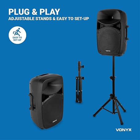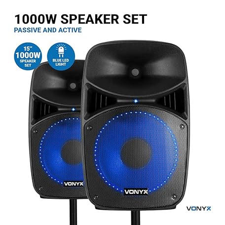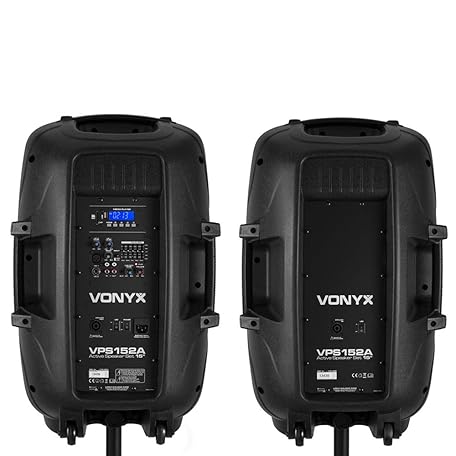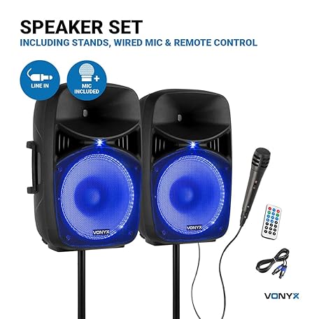 Thông tin sản phẩm Vonyx VPS152A 15-Inch Active Party Speaker System with Bluetooth, Speaker Stands, Wired Microphone & LED Lights – Complete DJ PA System for Karaoke, Events, Parties & Stage Performance