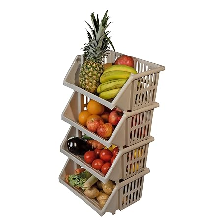 VR7 4 Tier Taupe Storage Stackable Baskets for Kitchen Shelving Unit Toys Free Standing Shelf Organizer Plastic Fruit Onion Potato Under Shelf Van Utility Room Stacking Basket Rack Large