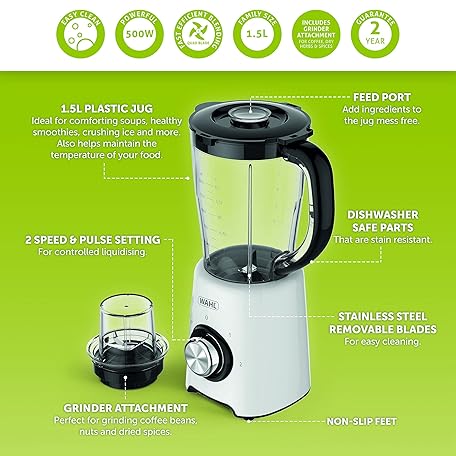 Thông tin sản phẩm Wahl Table Blender, 1.5 Litre, Plastic Jug, Grinder Attachment, 2 Speed, Pulse Setting, Dishwasher Safe Parts, Easy Clean, Stain Resistant, Make Smoothies Shakes Soups Sauces, Quick Blending