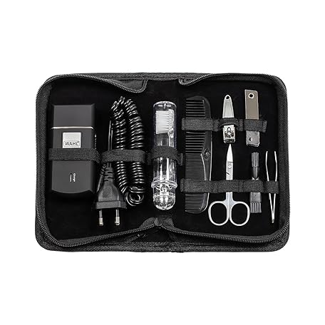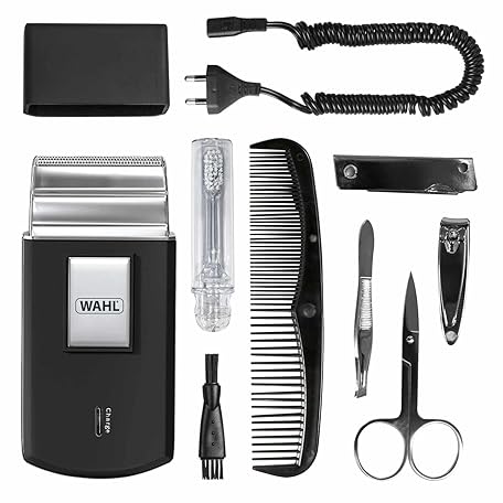 • Wahl Travel Shaver Kit, Rechargeable, Flexible Foil, Includes Toothbrush, Nail File, Scissors, Tweezers, Comb, No Nicks, Perfect for Travel, Small, Travel Case