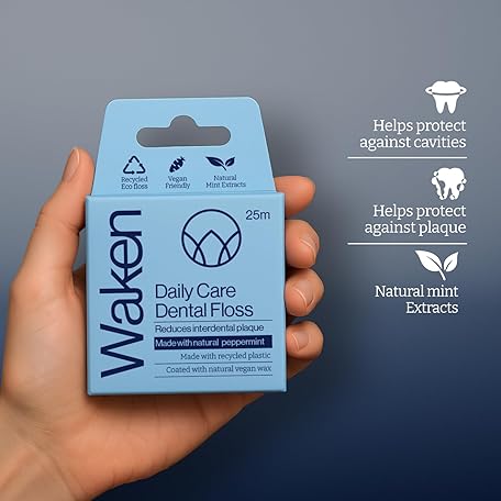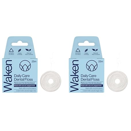 Sản phẩm Waken, 25m peppermint dental floss, 100% natural flavor, reduces plaque and gum disease, clinically tested, vegan floss, eco-friendly, sustainable packaging, 100% recyclable, white. (Pack of 2) đang được bán với giá ưu đãi là 0 tại nước Anh.
