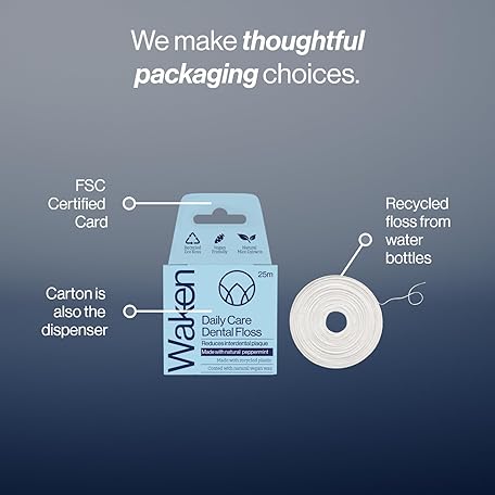 Thông tin sản phẩm Waken, 25m peppermint dental floss, 100% natural flavor, reduces plaque and gum disease, clinically tested, vegan floss, eco-friendly, sustainable packaging, 100% recyclable, white. (Pack of 2)
