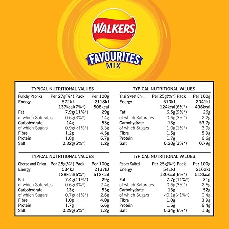 Walkers Favourites Mix Crisps Multipack 36 Mixed Pack - Cheese & Onion, Ready Salted, Max Punchy Paprika & Sensations Sweet Thai Chilli Boxed Treatz