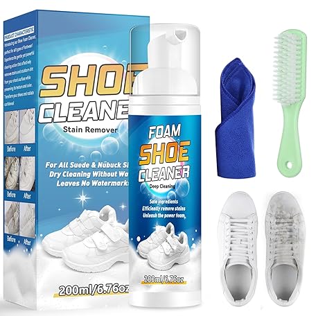Wansiven Shoe Cleaner, 200ml White Trainer Shoe Cleaner Foam, Powerful Stain Remover Shoe Cleaning Kit with Cleaning Brush & Cleaning Cloth for Shoes, Sneaker, Leather, Nubuck, Suede, Canvas